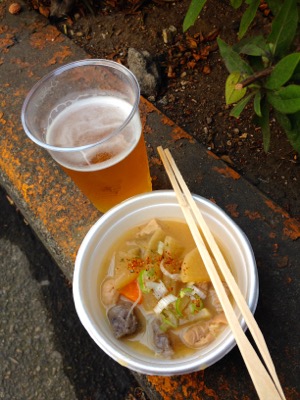 生ビール、焼き鳥、モツ煮、豚玉焼き。〆て800円。昼すぎに夕飯の買い物に出かけたら、そうだ、祭りだったんだと思い出し、一人ビールやっちゃいました。あまりの暑さにそこそこで帰っていったんお昼寝。