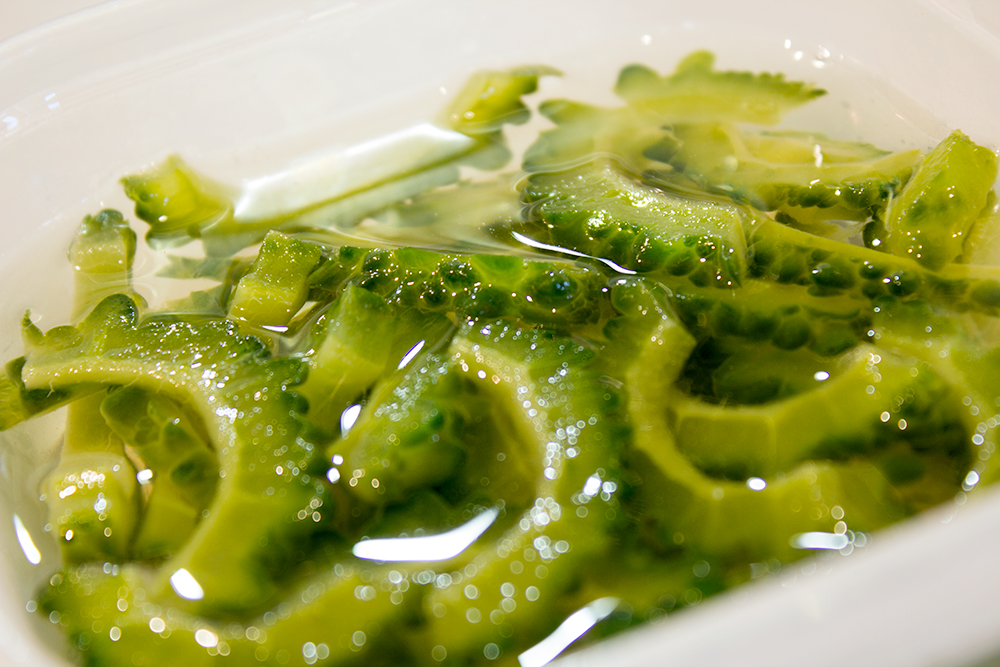 生のゴーヤを使う場合は、縦半分に切りスプーンで種と白い部分を取り除いた後、さっと塩ゆでし、粗熱をとってから使用します。茹でる時間は苦さのお好みにより、10秒〜1分。甘みももっと加えるのが普通だと思います。