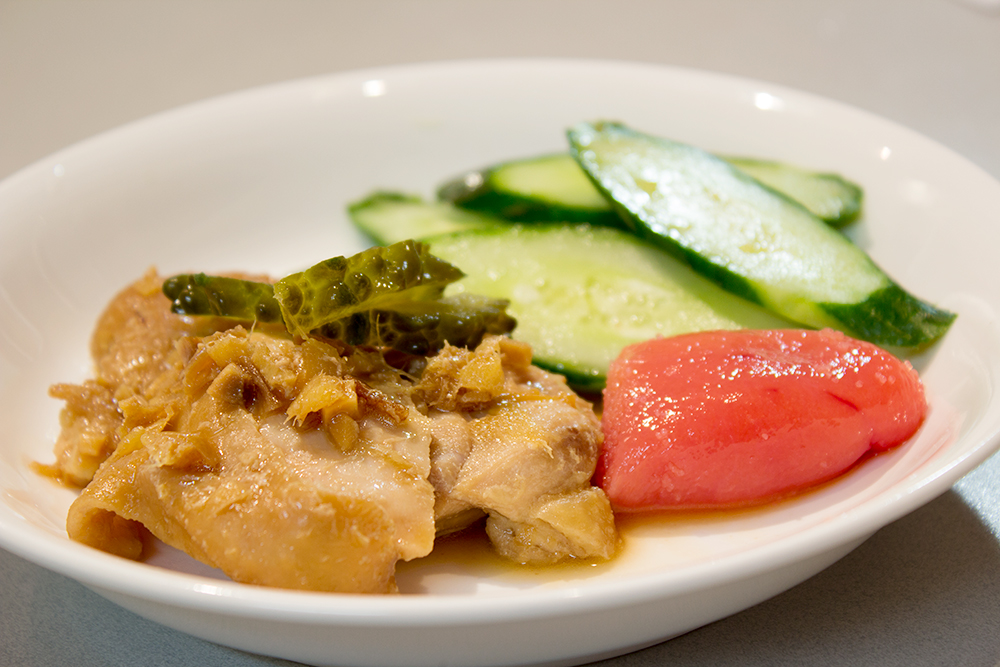 まだ若いゴーヤのピクルスを味見に少しだけ。酸味効いてます。ラストになった醤油生姜も盛り合わせ、ご飯の友に。食欲をそそります。