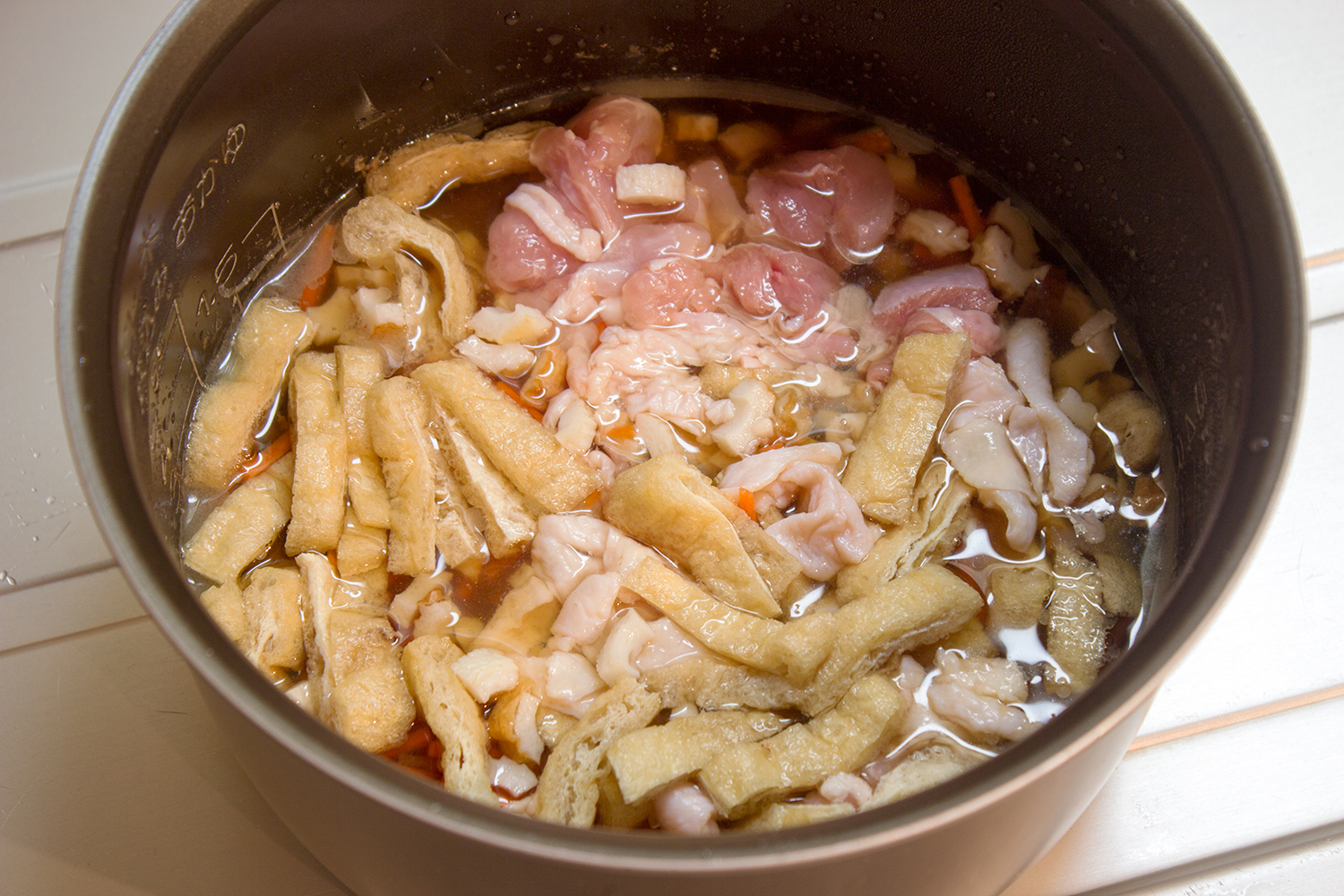 材料を全部放り込んでスイッチを押すだけ。あとは炊飯器が働いてくれます。炊飯器によって、自動で保温に切り替わらない場合は、ようすをみて1時間ほどで保温にしてくださいね。ご飯と違って、途中でフタを開けても大丈夫です。湯気で美味しさが逃げないように、そして真空(に近い)状態を保つために、なるべくなら開けないほうがいいのかなと思いますが。