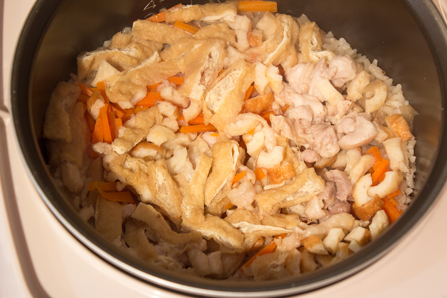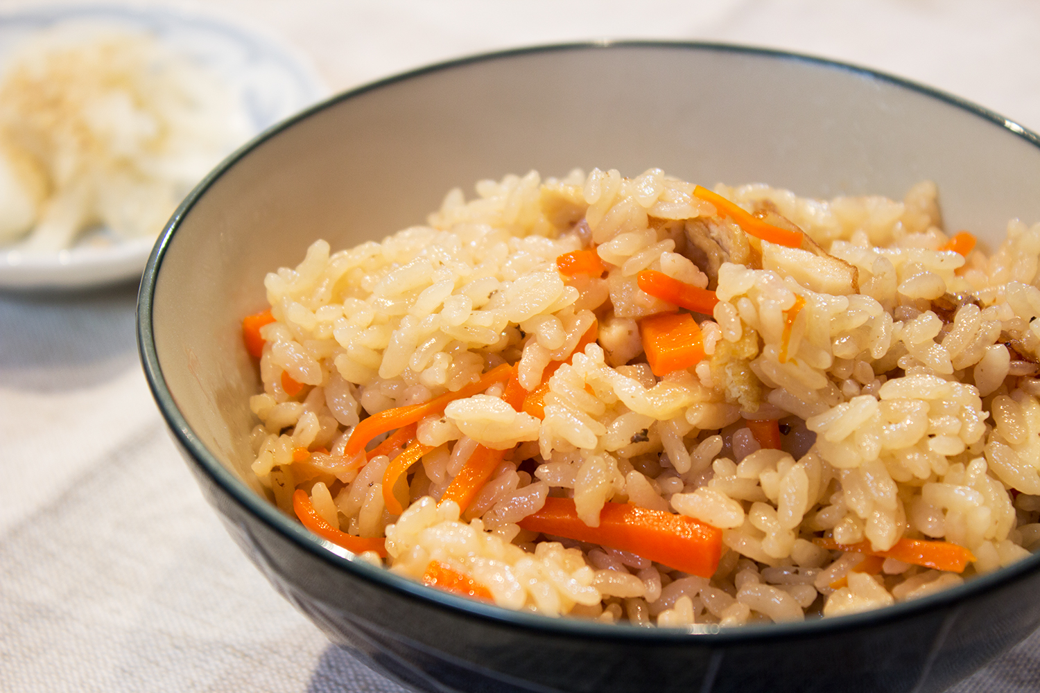 前日の煮汁がすごく美味しかったので、残り汁を活用して炊き込みごはんを作りました。鶏肉続きですが、贅沢を言ってはいられません。買い物に行く時間の余裕がないので冷蔵庫にあるもので作ります。