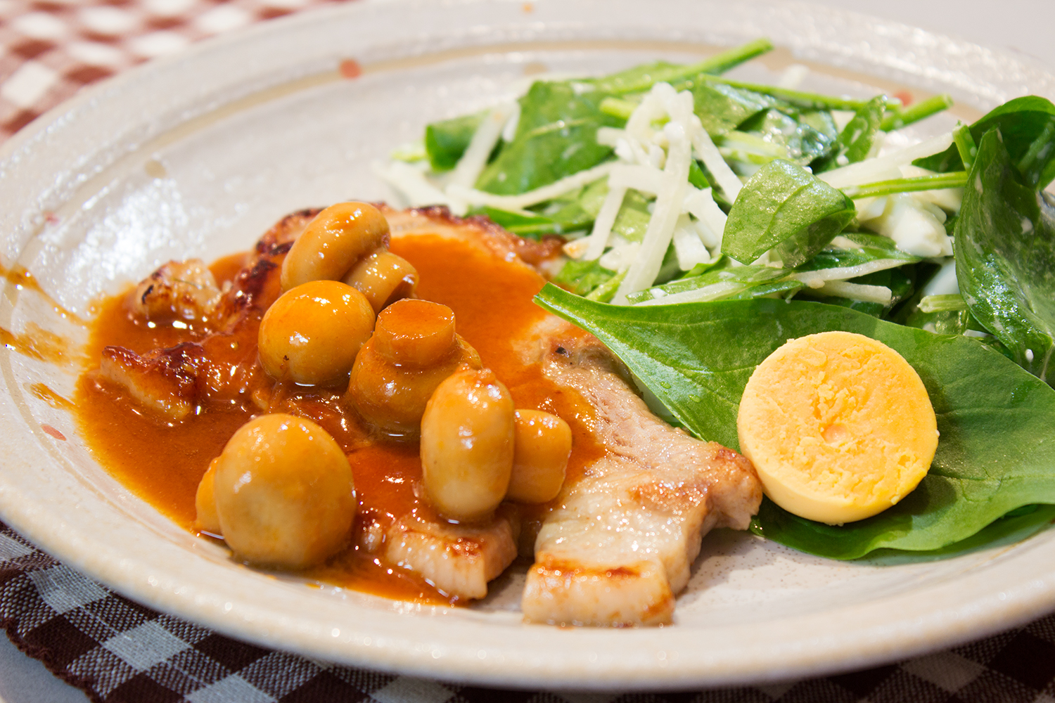 みなさま、ぜひ想像してみてください。このソテーのソースの上に、ふたつに割った、とろ〜り半熟のゆで卵が乗っかっている写真を。
