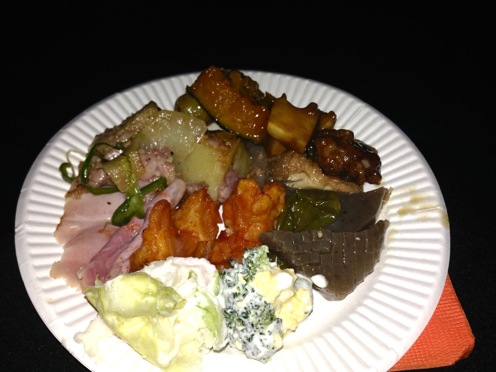 神宮外苑花火大会を見るイベントに参加しました。軽食・ドリンクありと聞いていて、思った以上にたくさんのメニューが充実していました。盛りすぎなほど取っちゃいました。花火が始まったら室内の照明が消され、おかわりの写真はフラッシュオンしました。写り悪いですね。ほかにもたくさん種類ありました。乾き物もたくさんありました。