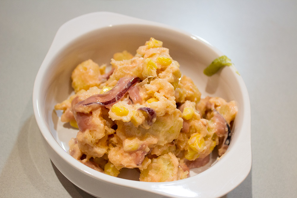 - 2がだいたい冷めたらイカ塩辛、コーン、bを入れ、ジャガイモをつぶしすぎないようにざっくり混ぜ合わせます。 器に盛り、練りわさびを追加で絞ります。Bの完成。