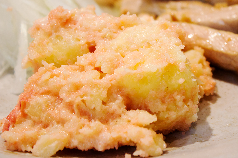 ポテトとタラマヨのコンビは最高。以前、イカの塩辛で作ったときと比べて、タラコのほうがマッチング度が高く、落ち着いているお味です。