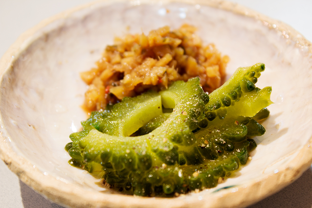 まだ若いゴーヤのピクルスを味見に少しだけ。酸味効いてます。ラストになった醤油生姜も盛り合わせ、ご飯の友に。食欲をそそります。