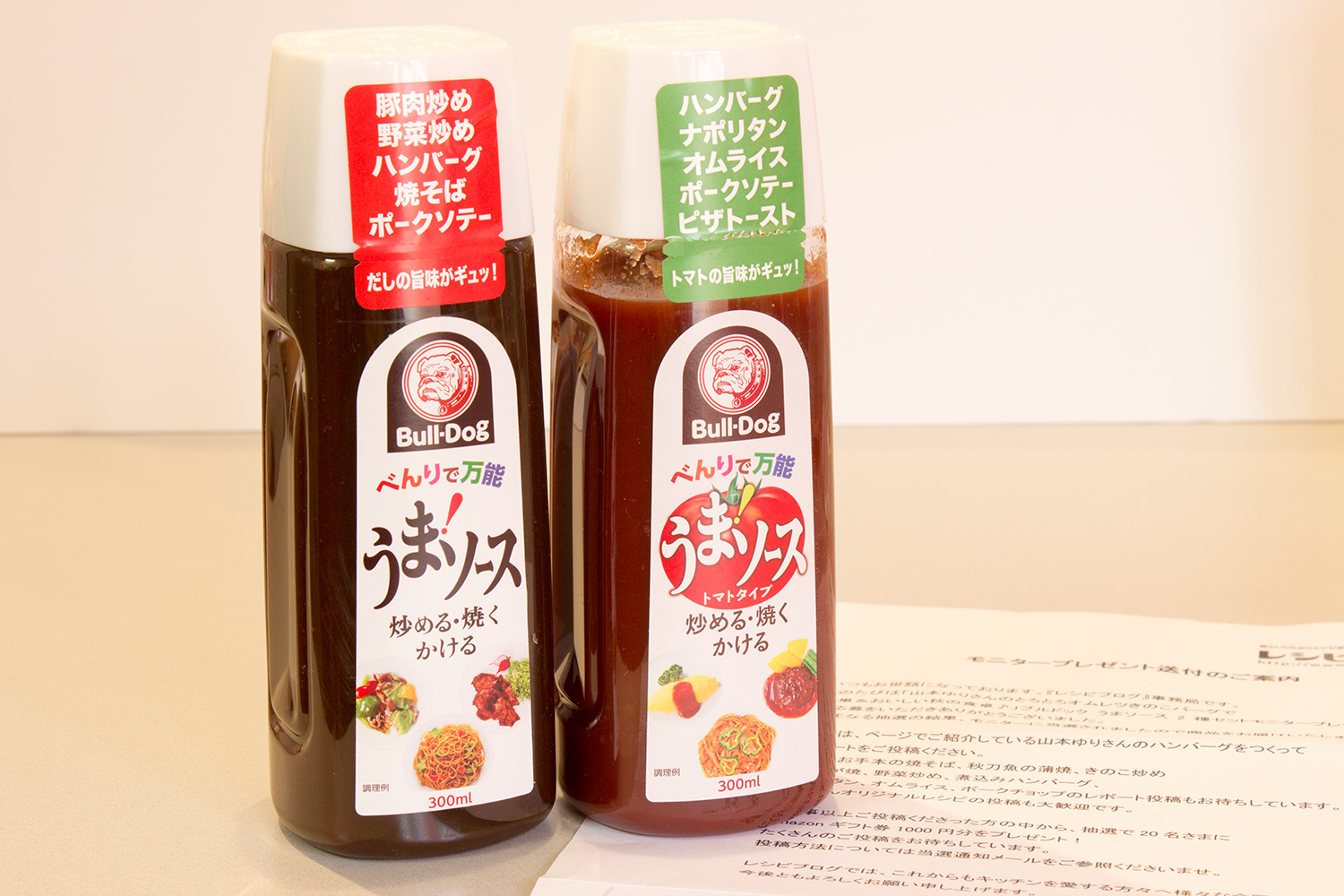 レシピモニターに当選し、うまソース2本セットを送っていただきました。中濃ソースと、トマトミックスソースです。トマトタイプのほうは、醬油、煮干しエキスなども入っています。