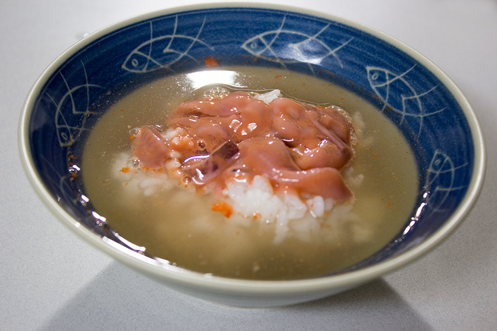 イカの塩辛茶漬けは、エビの茹で汁を使って出汁茶漬けにしてみました。