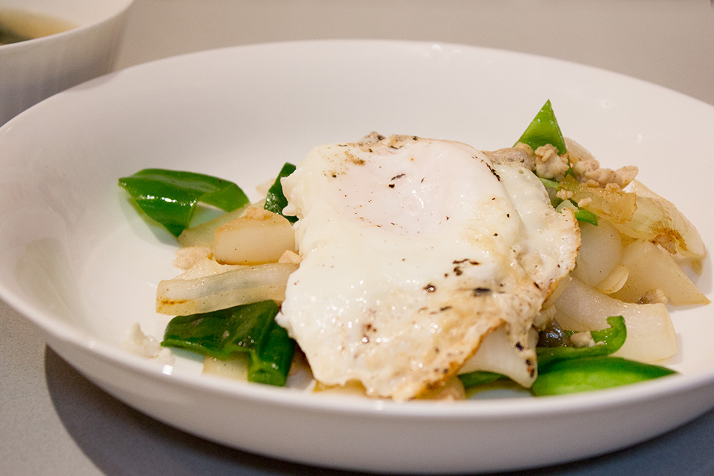 いつものことながら、昨日の使い残りを使います。具材は適当にあるもので。ネギが高いので、青みはピーマンに任せました。