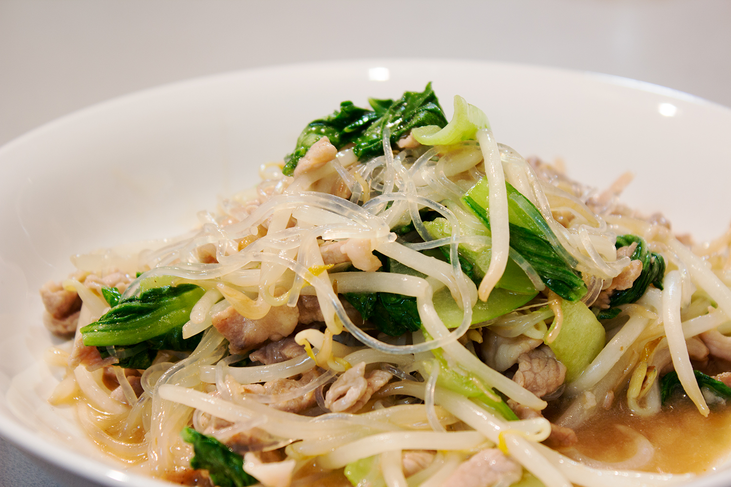 これでできた、という段になって気づいたのです。一瞬、春雨はなかったことにしようと思いましたが、入れるなら今入れなくては、との決断に迫られ、結局加え、1〜2分炒めました。その結果、豚肉、もやし、青梗菜が若干煮えすぎになってしまいました。あう〜〜〜。