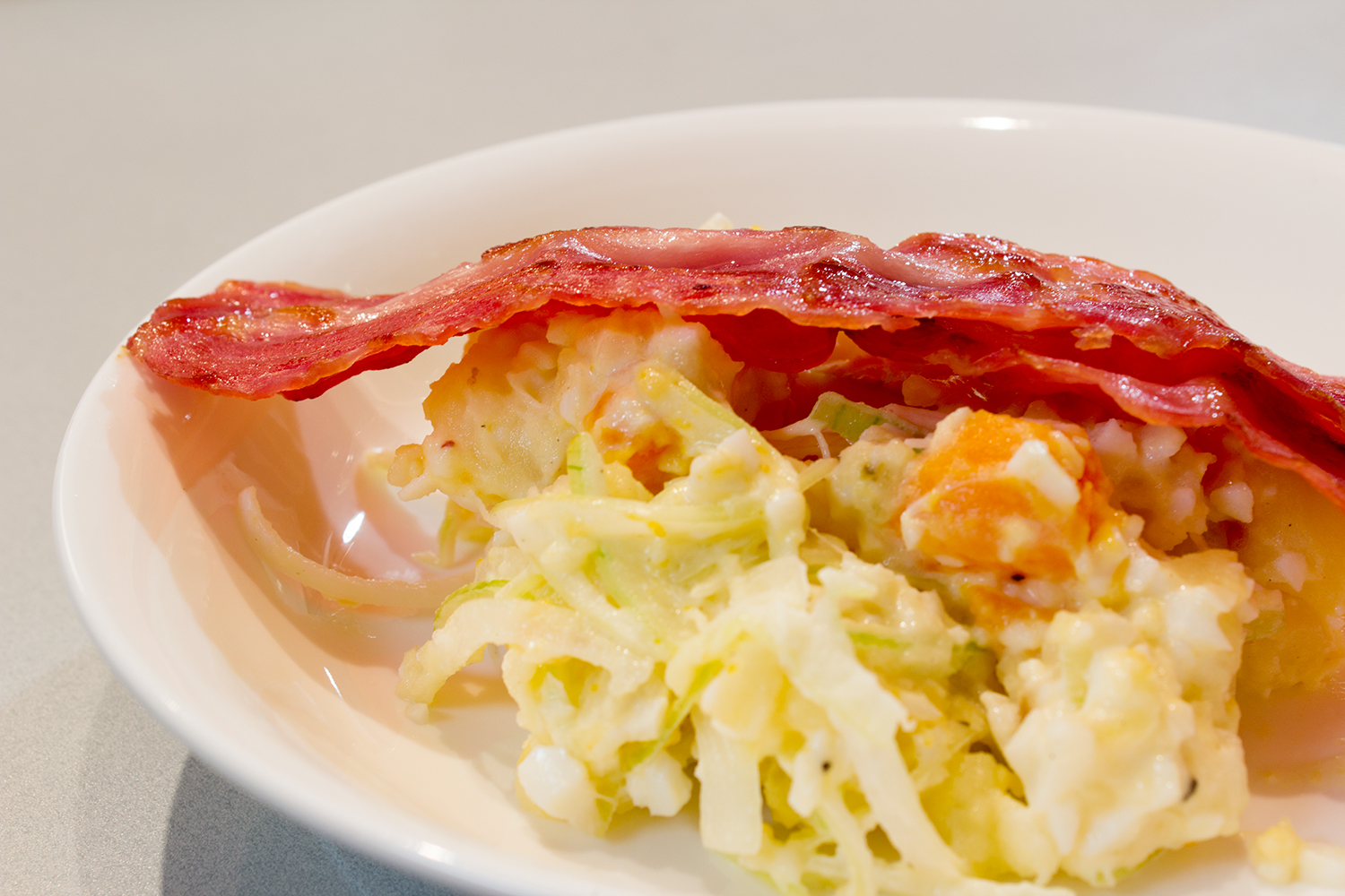ポテサラ登場回数多いかも。内容はいろいろ変えています。ベーシックなジャガイモ+玉ねぎ+卵は飽きないですね。長いままのベーコンを乗せて、スペシャル感を醸し出してみました。