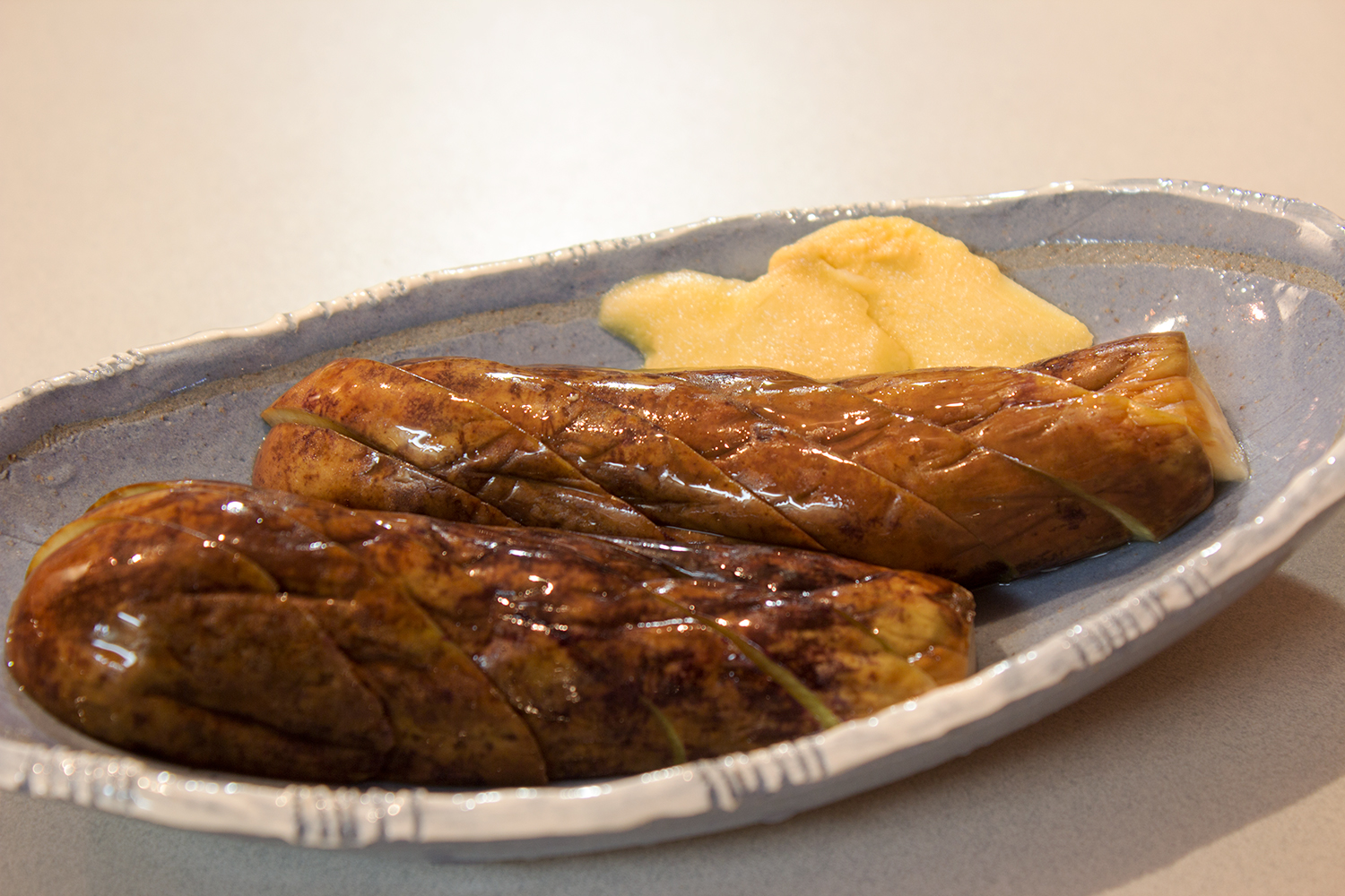 3〜4日前に、1本だけ残ったナスを粉からしと塩でつけていたやつの出番。漬かり具合がイメージと違う。塩が少なかったもようです。