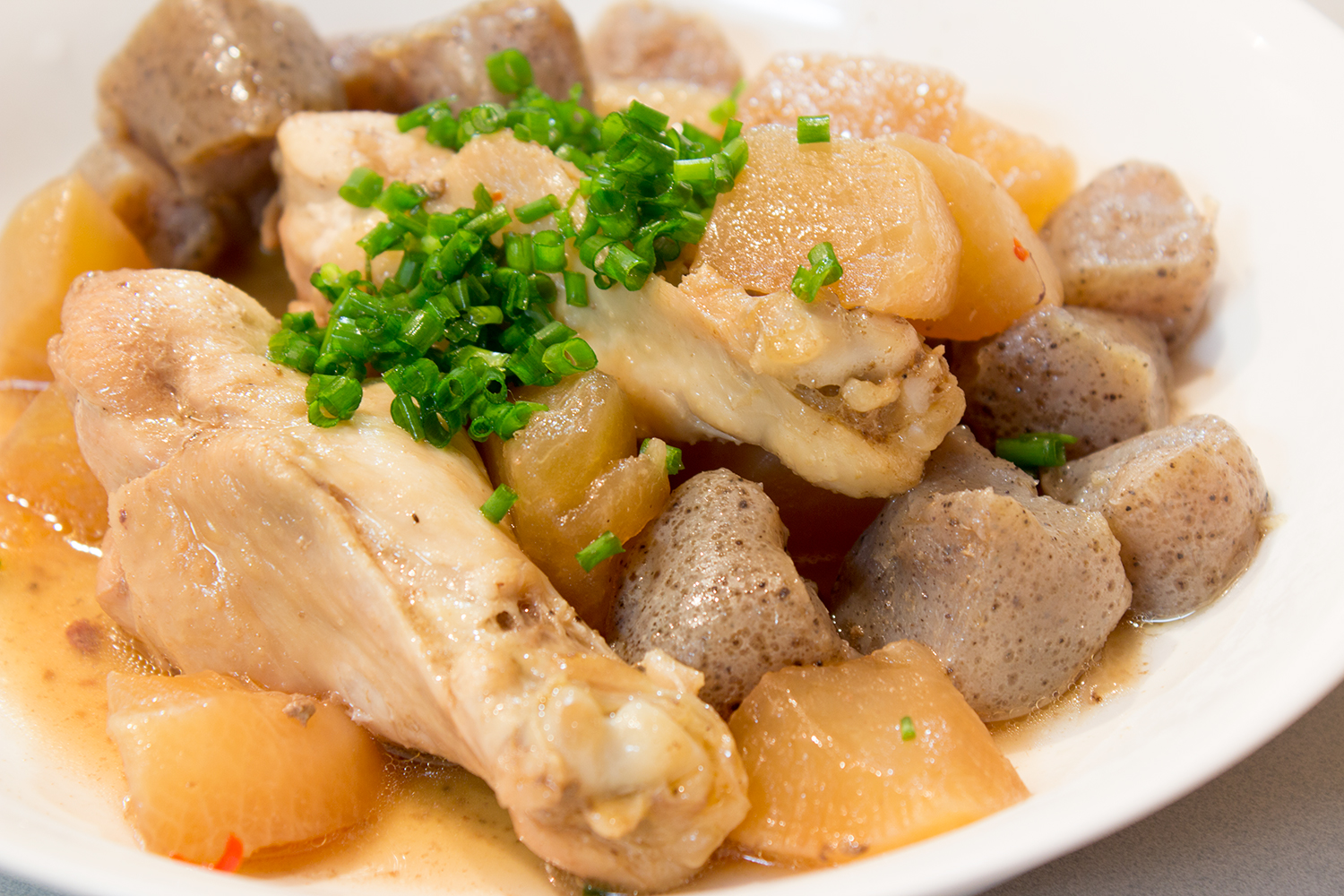 さて、煮物は前もって作っておけるので、提供前に慌てる必要がないぶん、他のメニューに専念できますね。大根と手羽元だけにして、ピリ辛コンニャクを別に作ることも考えたのですが、もろもろ事情により、ごいっしょさんにしました。