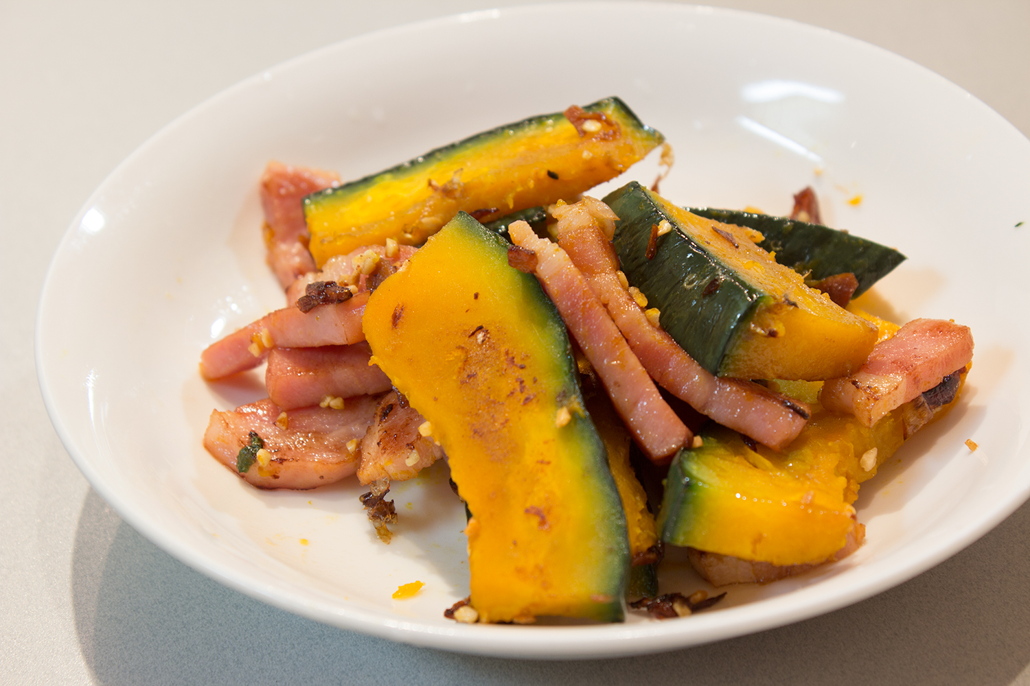 かぼちゃの活躍する季節です。北海道産のかぼちゃ、甘みがたっぷりでほくほくです。旬を味わう感満載。ベーコンとの相性もグッドです。