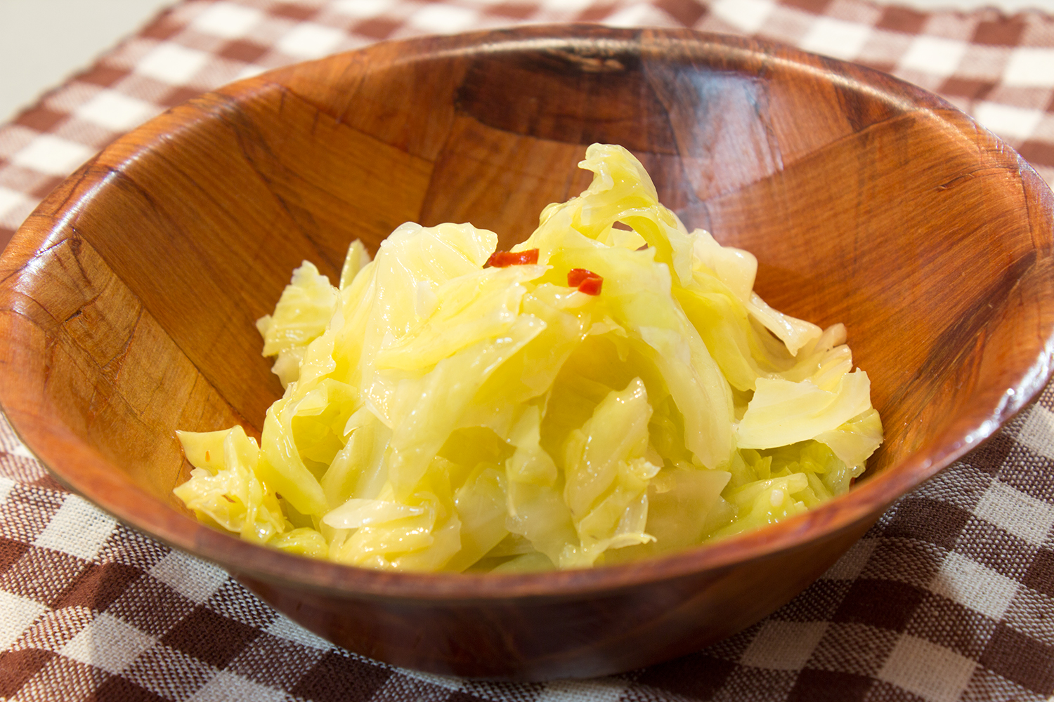キャベツは一玉買いをして外側から1枚ずつ剥いで使うのが痛みにくいのですが、大きくて余りそうなとき、さっと作っておくと数日楽しめます。すぐでもおいしくいただけますし、タッパーに入れて冷蔵保存で。