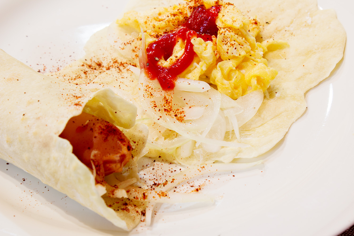 そしてとりあえず2枚を焼いてまずは具を巻いて写真撮影を。わあ、ちょっとぱりぱりで巻きにくい〜。焼きすぎなのかあ?
