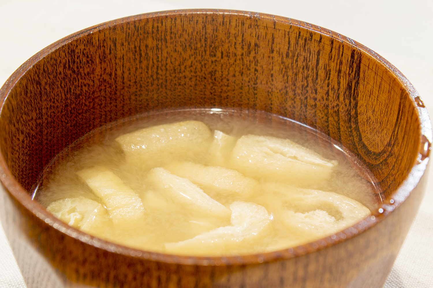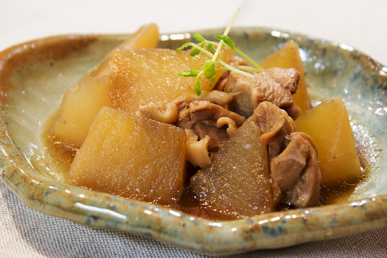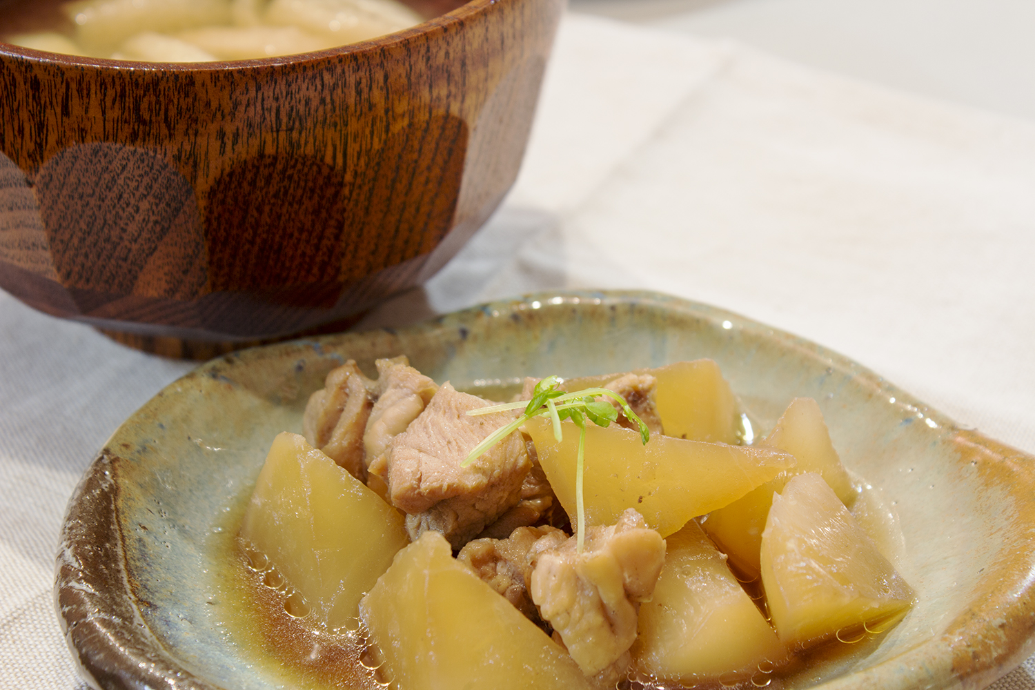 冷めるときに味がしみるので、少し早めに炊いておいていったん冷まし、直前に温め直して提供しました。大根は柔らかく煮ると消化が良いです。鶏肉の身の部分も消化がよい食品です。味噌汁の具は油揚げと、繊維と直角方向に小さめに切った玉ねぎ。