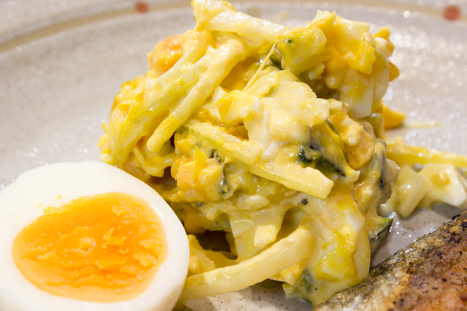 ポテトサラダならぬパンプキンサラダ。かぼちゃは大きめにカットして存在感大。混ぜるときに、少しでかすぎるかなと思ったら、木しゃもじでざくざくつぶします。不規則に崩したらかっこいい。オリーブオイルとスパイスでちょっとオトナのサラダです。