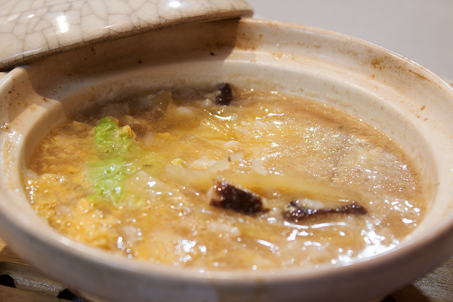 食べ終わってスープが残っているので、ごはん、溶き卵で雑炊にしました。白菜の青い部分を少量残しておき、ここで加えました。
