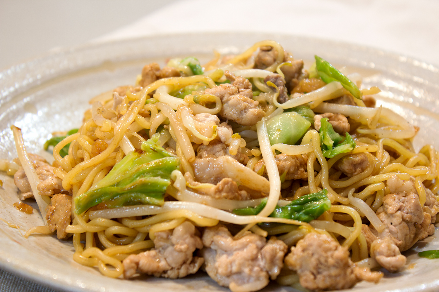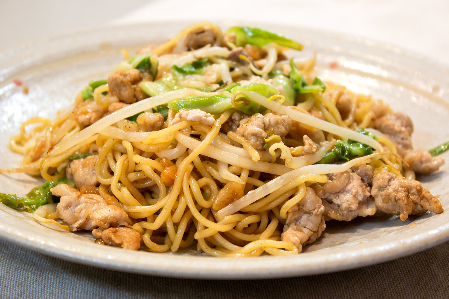 時間をかけるとベチャベチャになって美味しくないです。キャベツやもやしもくたくたにならないよう、手早く炒めます。でもぱさぱさというのじゃなくて、ソースでしっとり。