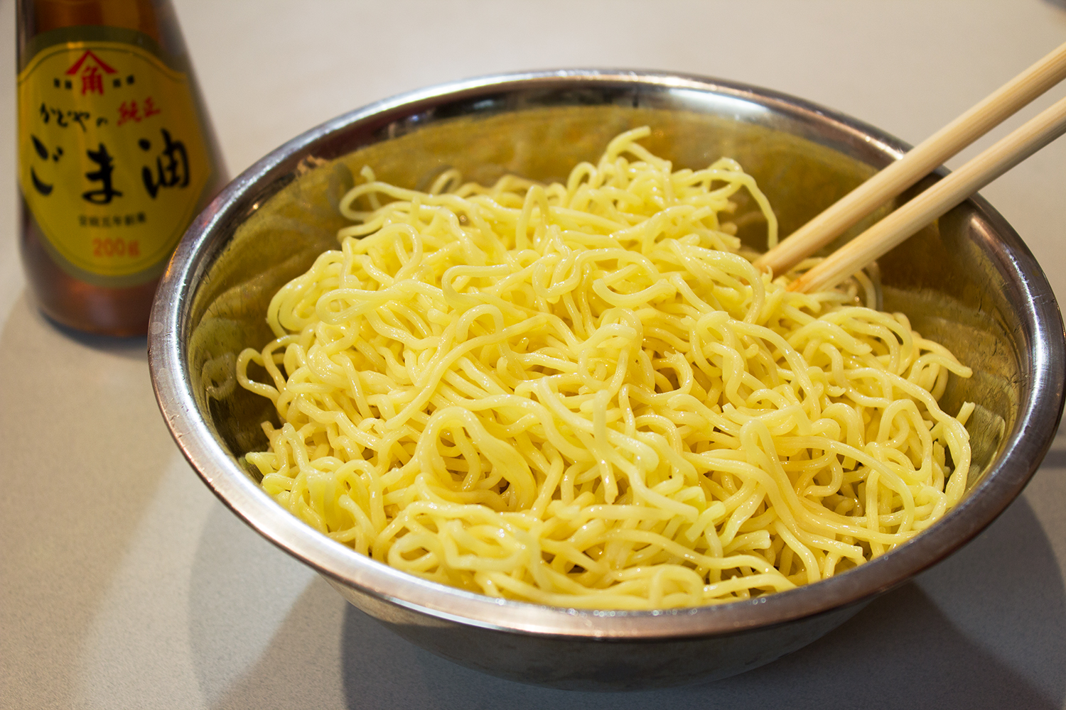 あらかじめ麺をほぐしておきます。この麺は、袋に、水でさばくと麺が切れるのでしないでと書かれていました。室温に戻しておくだけでも、ほぐれやすくなります。