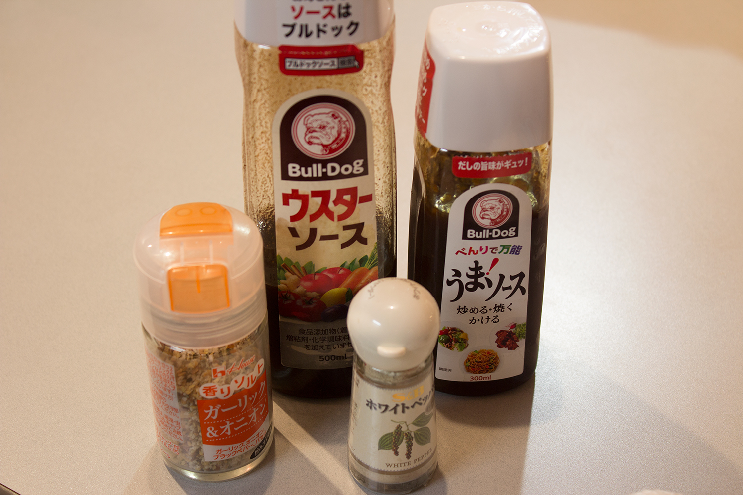 う〜ん、やっぱり美味しかった。うまソースのスパイスが効いて、ソース少なめでもしっかりお味がついています。コショウは普通のコショウでいいです。切れていたので白胡椒を使いました。