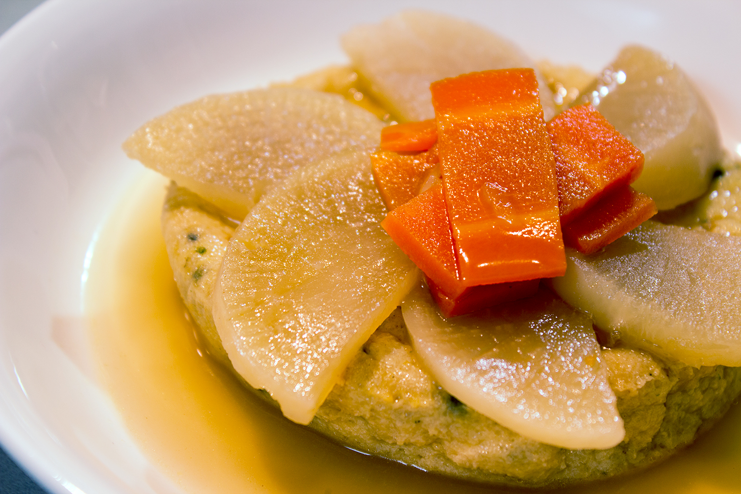 大根を風車状にならべました。はて、ニンジンはどうしよう。仕方なく上に乗せました。これを輪切りにしていれば! ビジュアル的におもしろかったのに。というわけで、輪切りにしてください。