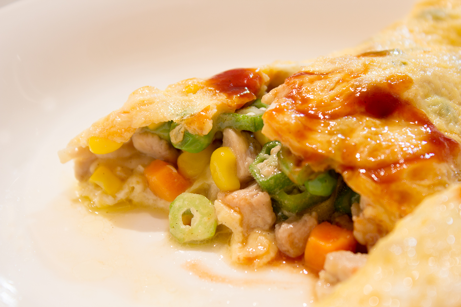 具材はオクラメインです。ネバ感が卵のとろとろ感と相まって元気が出そう。卵の表面は焦げ目がつかないのを目指していましたが、少し部分的に茶色に。余熱を使いこなさなくては。あと、フライパン(オットのもの)を手なずけるか、一回り小さい自分用を買おう。