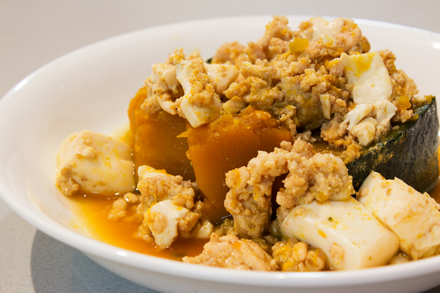 これから美味しいかぼちゃ。どう料理しようかなあと巡らせた結果、ここのところ油続きなこともあり、昨日の使い残りの鶏ひき肉と豆腐を使って、まずは和風にシンプルに煮ることにしました。